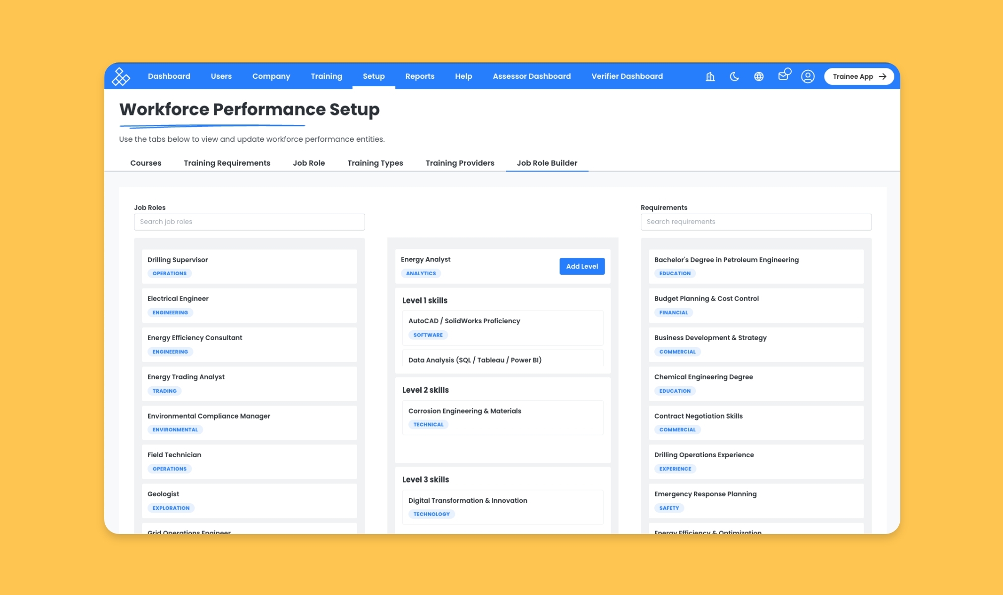 Track employee development from entry-level through to leadership programmes. Show people their pathway and what competence they need next.